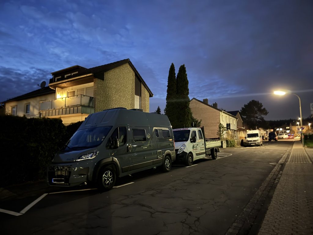Gestern Abend. Blauer Himmel in der Dämmerung, warme Lichter in den Fenstern, ruhige Wohnstraße – und unser 5,99 m langes Zuhause auf vier Rädern ganz selbstverständlich am Straßenrand geparkt.